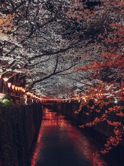 在夜裡,點燈目黑川能營造更不一樣的氛圍,櫻花本身並不會發光,只能透過光線或反射打亮,善用夜間光影變化同樣是突顯主體的方法。
